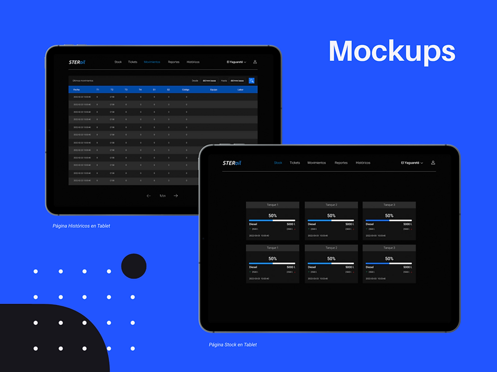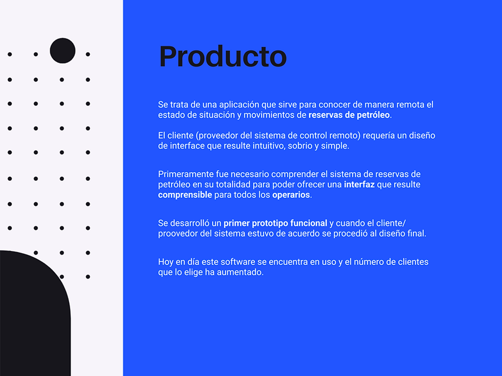 La aplicación permite el monitoreo remoto del estado y los movimientos de reservas de petróleo. El cliente, un proveedor del sistema de control remoto, requería un diseño de interfaz intuitivo, sobrio y simple. Para lograrlo, fue crucial comprender profundamente la funcionalidad del sistema y así ofrecer un diseño accesible para todos los operadores.