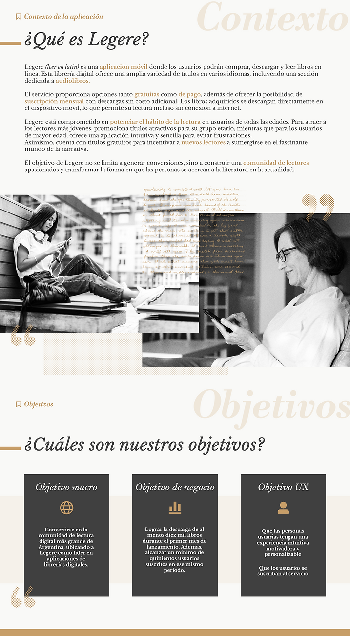 In the UX Writing project for the Legere application, a comprehensive analysis was conducted to enhance the user experience. The work included defining the brief, implementing storytelling, determining the tone and voice, as well as researching user personas and benchmarking. A empathy map and proto-personas were developed to better understand the needs of the target audience. The result was the creation of an application with user-centered design and wording that communicates clearly and cohesively, highlighting Legere's unique identity in the digital bookstore market.